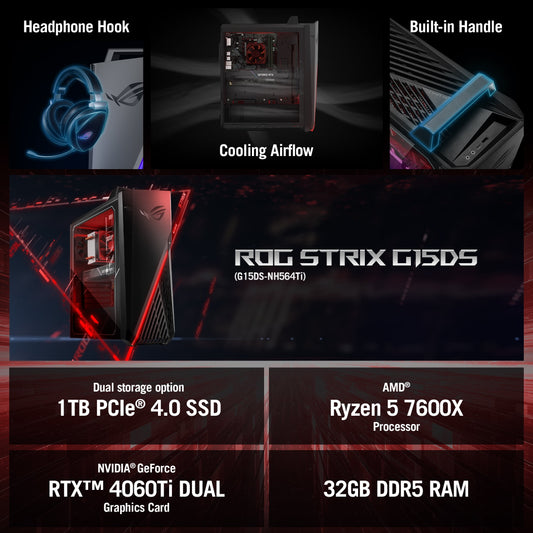 ROG Strix Gaming Desktop, AMD Ryzen 5 7600X, Geforce RTX 4060 Ti DUAL, 32GB DDR5, 1TB Pcie SSD, G15Ds-Nh564Ti